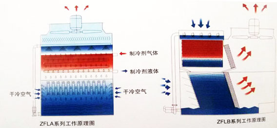 ZNX型蒸發(fā)式冷凝器以水和空氣為冷卻介質(zhì)與盤管內(nèi)的高溫氣態(tài)制冷劑進(jìn)行熱交換制冷劑由氣態(tài)冷凝成液態(tài)。內(nèi)部設(shè)水分配系統(tǒng)、根冷凝盤管組、填料熱交換層、除水器等。外部設(shè)循環(huán)水泵、盆管側(cè)面頂部設(shè)軸流風(fēng)機(jī)。在軸流風(fēng)機(jī)的作用下,內(nèi)部成負(fù)壓狀態(tài)。工作時,冷卻水由水分配系統(tǒng)在強(qiáng)動的風(fēng)力下均勻地完全覆蓋在盤管表面,高溫氣態(tài)制冷劑從盤管上部進(jìn)入,被冷凝的液態(tài)制冷劑從管底都流出,在該過程中,高溫制冷劑與盤管外的水、空氣進(jìn)行熱交換,再借助風(fēng)勢,換熱效果顯著提高。冷卻水和空氣吸熱后溫度節(jié)別升高,部分冷卻水氣化形成水蒸氣,蒸發(fā)帶走大量的熱量由風(fēng)機(jī)吸走排入大氣,同時熱空氣中的水分被除水器截止集水池中,沒有被氣化的高溫冷卻水流入填料熱交換層被流經(jīng)的空氣帶走熱量使其冷卻,經(jīng)充分冷卻后的冷卻水流回集水池中供循環(huán)泵重新送入水分配系統(tǒng)繼續(xù)循環(huán)工作。數(shù)失到大氣中的水分由集水池內(nèi)的浮球閥控制水位,給予及時補(bǔ)充。